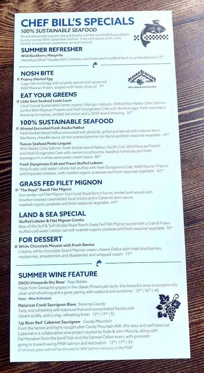 Wild Alaska salmon, halibut, cod, wild Mexican Pacific prawns and crab. Consuming raw or undercooked meats, poultry, seafood, shellfish or eggs to your specification may increase your risk of foodborne illness, especially if you have certain medical conditions.